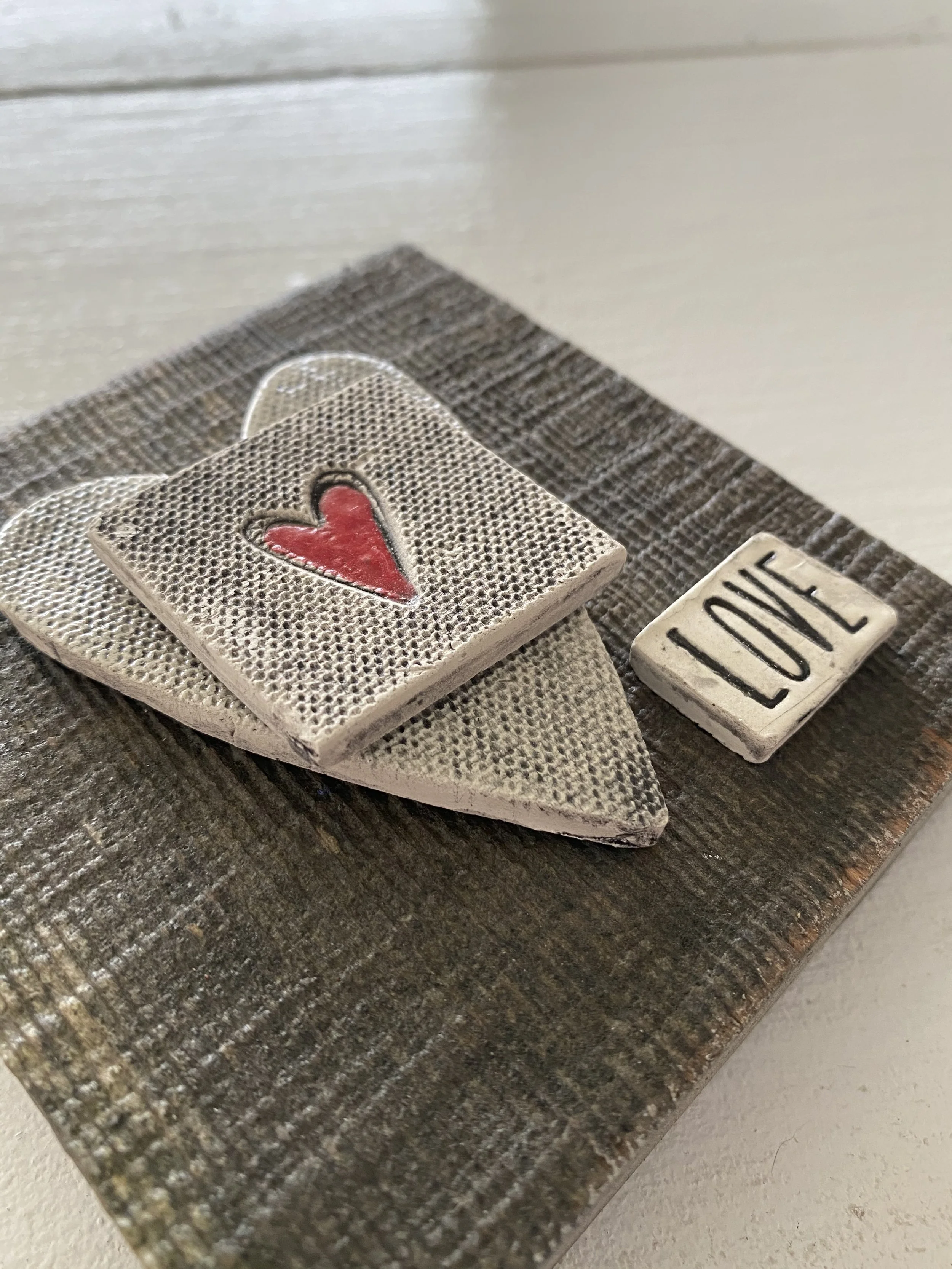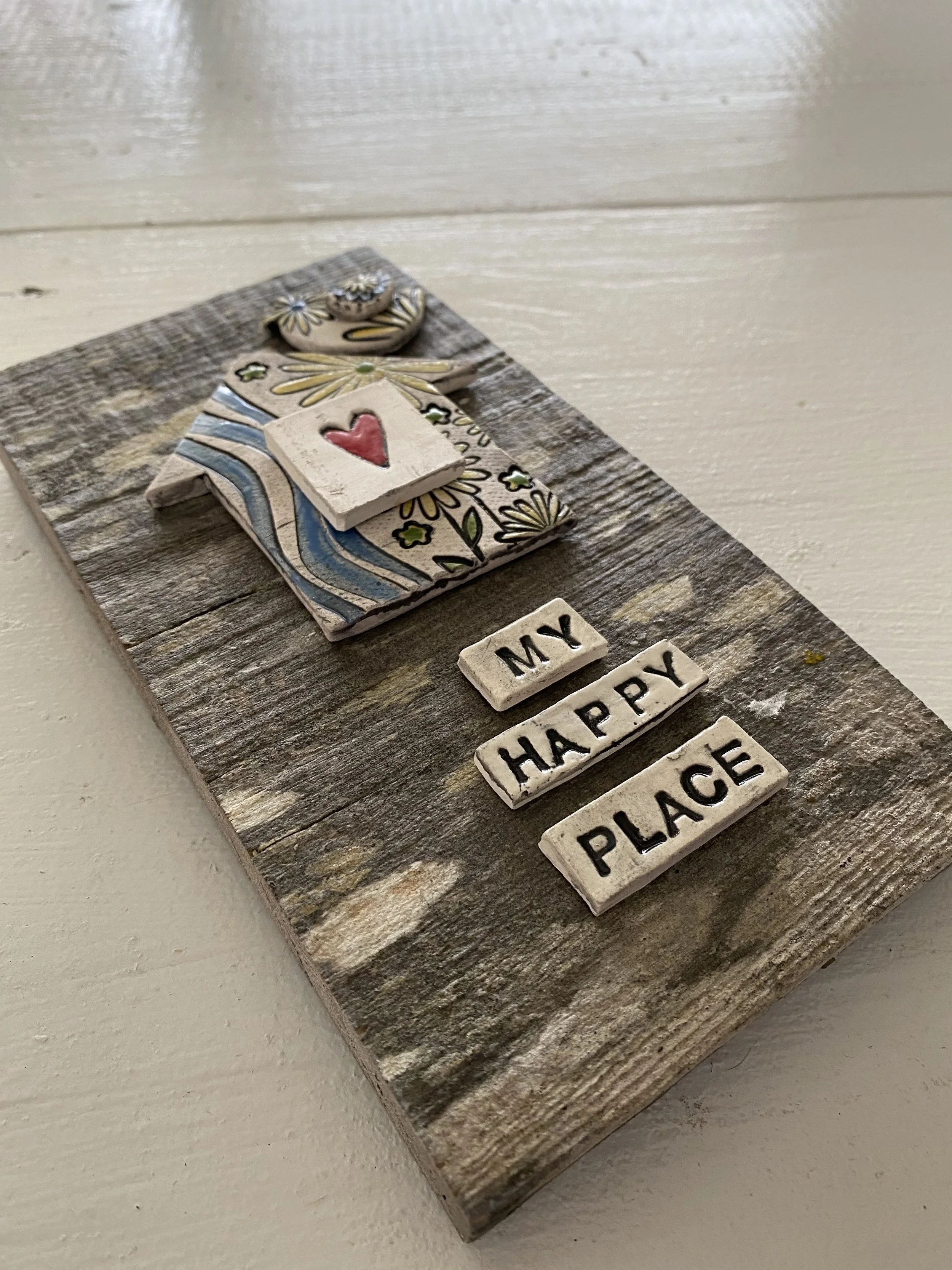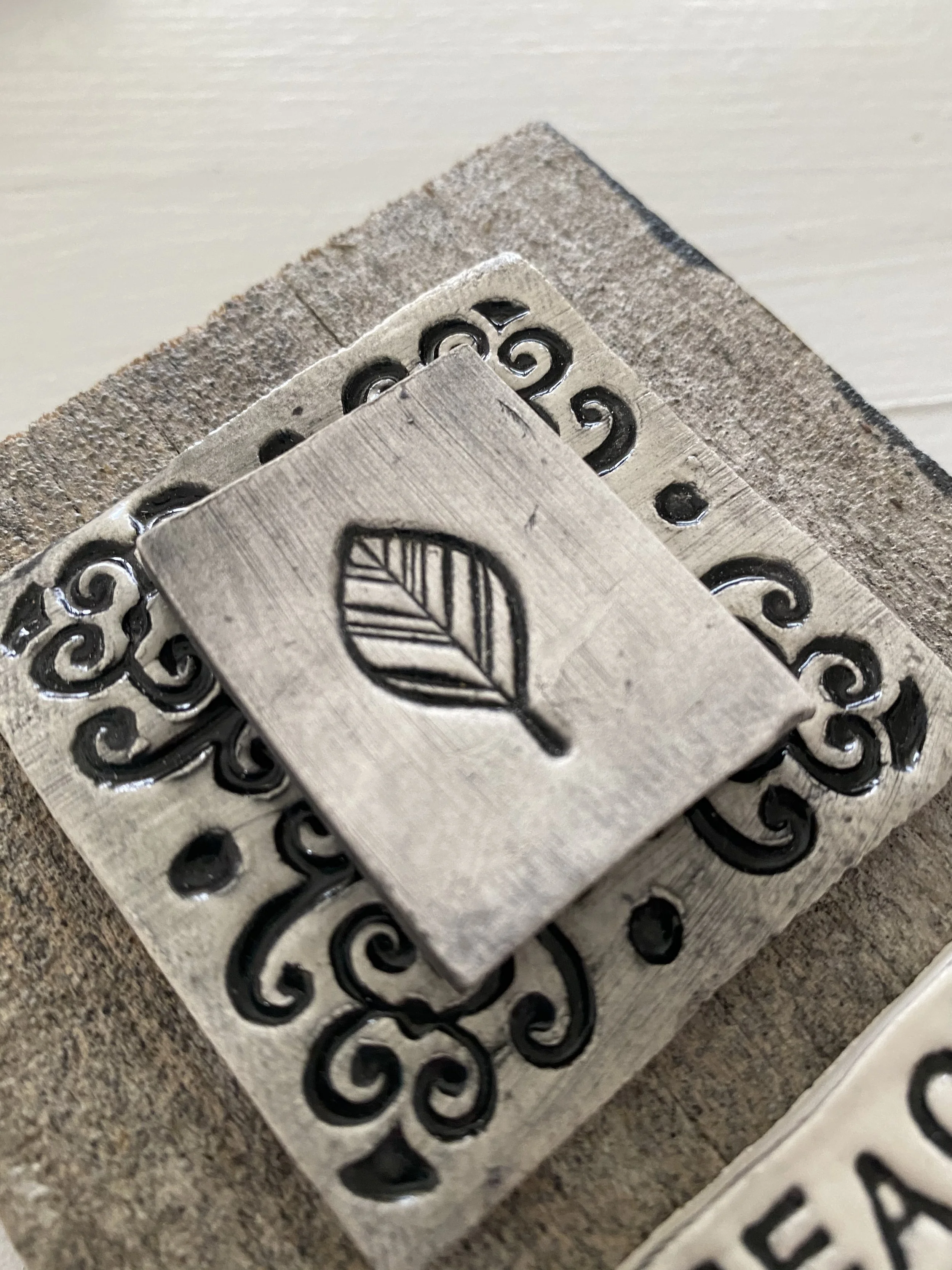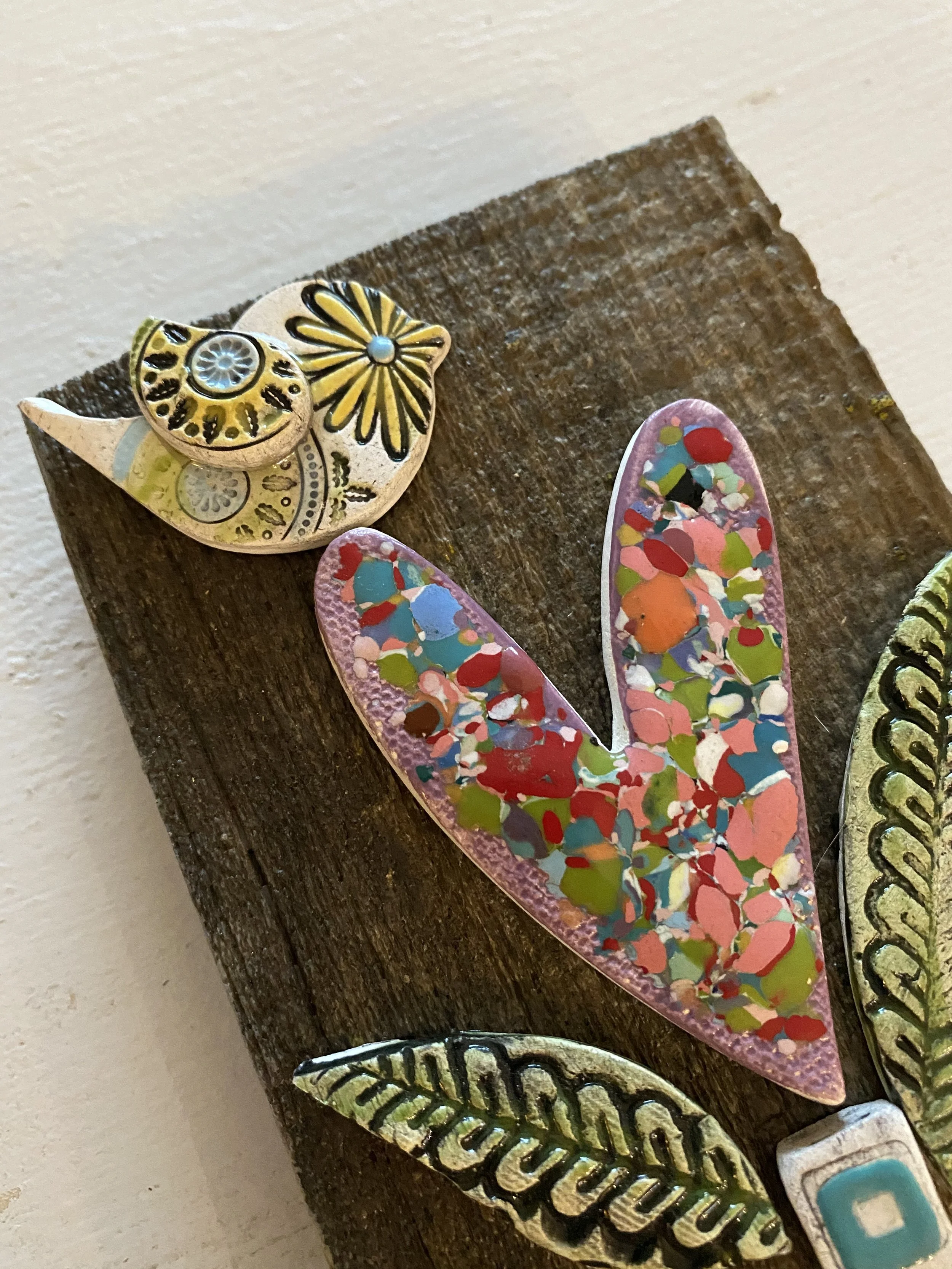 My ceramic art is a rebirth of my creativity. When my mother Aleene passed in 2015, I walked away from the crafting world. In 2021, my sister Heidi Borchers suggested I play with some clay, and it didn’t take long before I was hooked on creating stamped clay, featuring bright kiln-fired colors and textures. After collecting a few hundred pieces, I decided that I would start assembling them into small one-of-a-kind wall art.